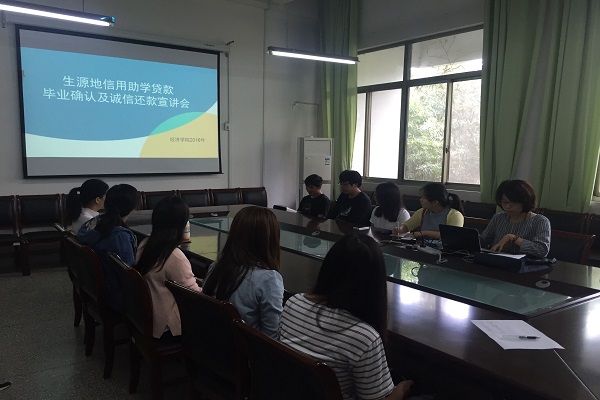 为认真落实学生处《关于做好2016届毕业生国家助学贷款毕业确认工作的通知》,2016年5月20日上午10:00经济学院辅导员许雯老师在经济学院会议室召开2016届毕业生生源地信用助学贷款毕业确认及诚信还款宣讲会,给大学期间办理过生源地助学贷款的大四学生讲解生源地信用助学贷款毕业确认流程和还款方法。