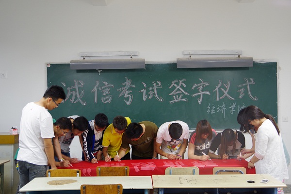 为了严肃考风考纪,5月22日晚,经济学院13级各班举行诚信考试签名活动。活动开始,先由各班班长宣读诚信考试宣言,然后班级同学依次在宣言条幅上签名。本次签字活动本着提醒13级学生诚信考试的目的,实现自我监督、自我约束,提高每位同学诚信考试的意识。签字活动结束后,同学们纷纷表示,要在期末考试中诚信考试,真实展现自己的学习成果。