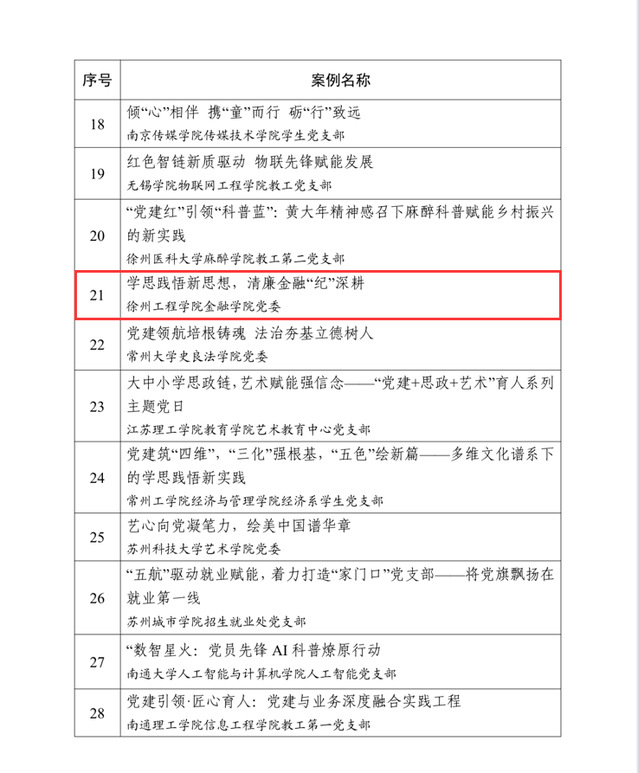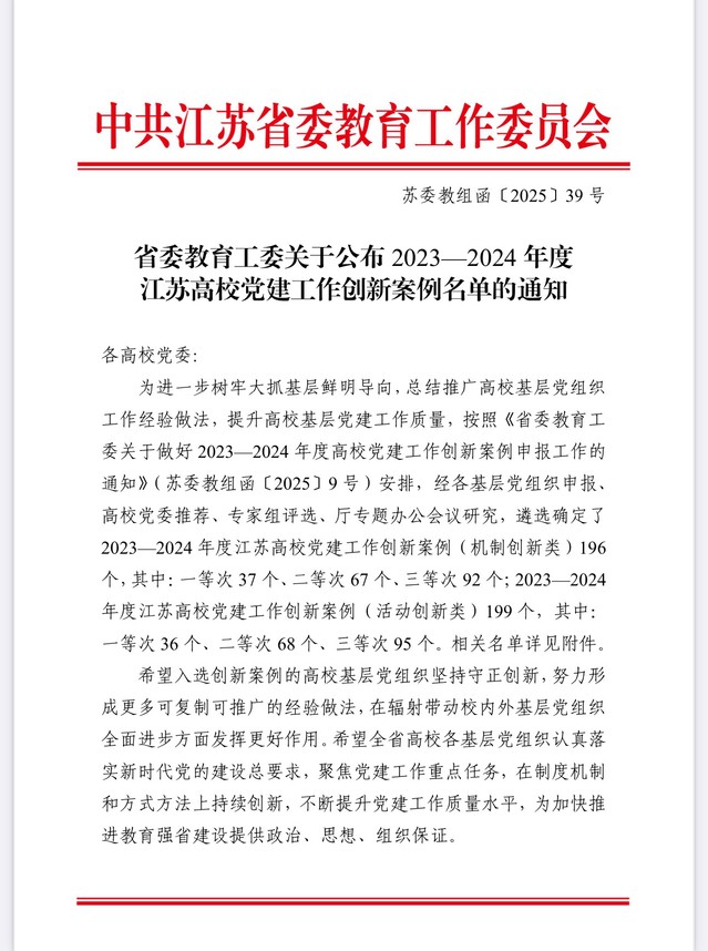 日前,江苏省委教育工委公布了2023—2024年度江苏高校党建工作创新案例名单,英国上市公司365党委上报的《学思践悟新思想,清廉金融“纪”深耕》获得高校党建工作创新案例(活动创新类)二等次。