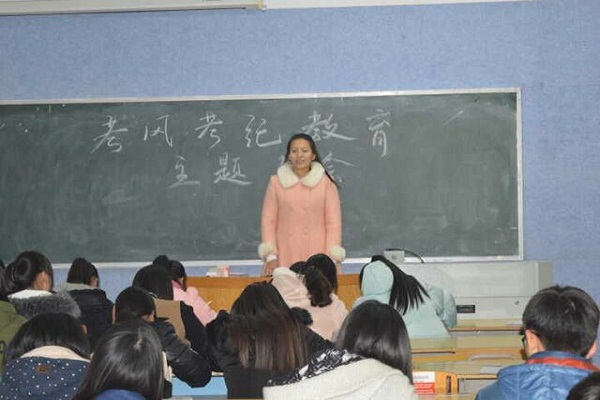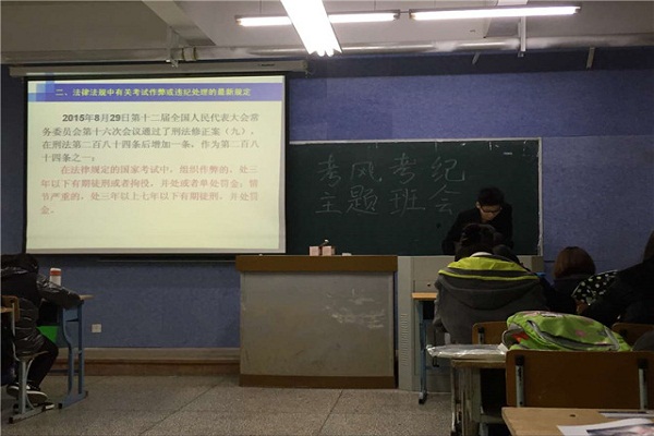 为了严肃考风考纪,加强大学生的诚信教育,营造文明、诚信考试的良好氛围,同时也为了提高大学生的道德修养和思想素质。经济学院于12月13号在城南校区南主楼的各班自习教室组织开展“严肃考风考纪”主题班会。倡导大学生将“以诚信应试为荣,以考试舞弊为耻”铭记在心,用真实可信的成绩展现自己的学习能力和学习效果,做崇尚诚信的好青年。