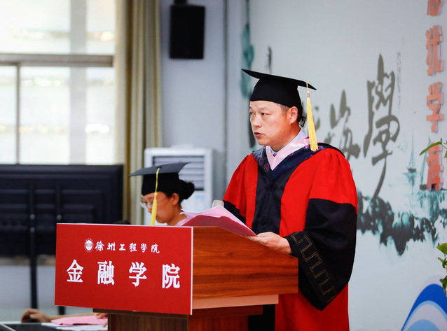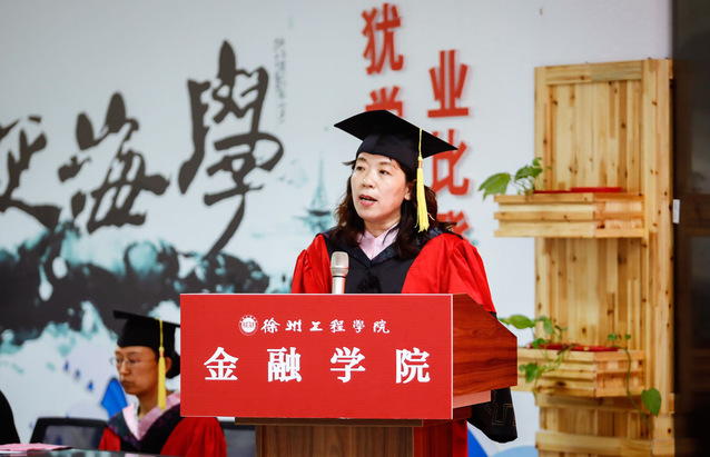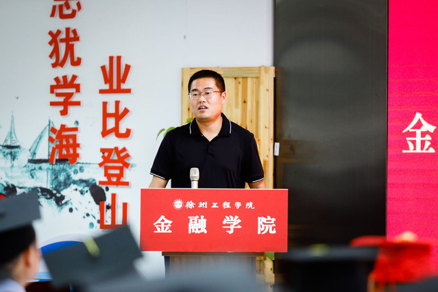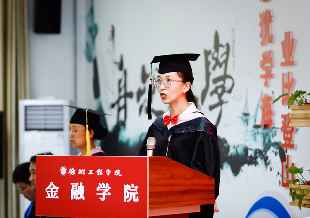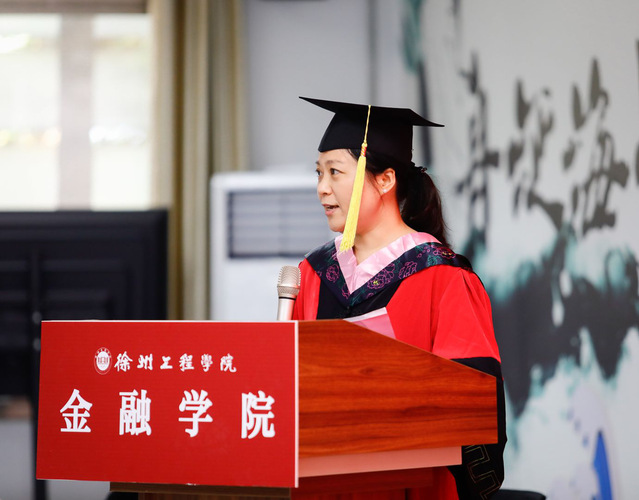 优秀毕业生代表16财管2班张祎发言,她深情回顾了自己来校求学的四年时光,她说,在徐工院,自己收获了知识和技能、感受到了亲情和温暖、懂得了责任和担当,同时也对老师的辛勤培养表示感谢,并祝福母校再出华章、再创辉煌,争取早日建成徐州大学。杰出校友代表2008届选调生,现任铜山区何桥镇镇长郝景帝同志在发言中对即将完成学业的学弟学妹们表达了祝贺,从自身的成长历程鼓励同学们踏入社会要刻苦学习、勇于创新、努力专研、脚踏实地。教师代表经济学教研室何颖教授表达了一个惜别毕业学生的教师的真情实感,用亲切的语言鼓励同学们学会从挫折中获得智慧,成为更加强大的自己,寄语毕业生带着思考、勇敢和乐观,继续接下来的人生之路。