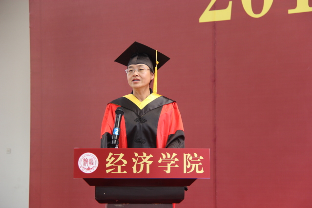 经济学院学位评定分委员会主席,经济学院院长董金玲教授作了《求真 为善 至美》的主题演讲。董院长在讲话中对全体毕业生圆满完成学业、踏上人生新征程表示祝贺,对同学们在大学四年取得的优异成绩表示肯定,对同学们为学院发展做出的突出贡献表示感谢,并向毕业生同学们提出了“求真”“为善”“至美”的三点要求。她从做人要求真、学习要求真、工作要求真三个层面说明了“求真”的内涵;从善待自己、善待他人两个角度解读了“为善”的要义;从内在美和外在美两个维度阐释了“至美”的意义。