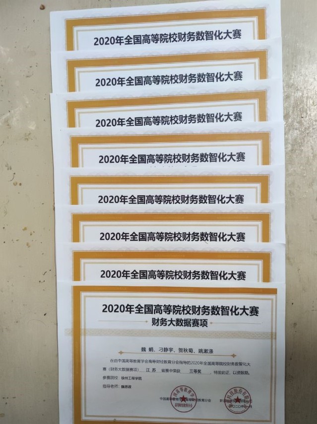 近日,为期九天的2020年全国高等院校财务数智化大赛江苏省省赛圆满收官。由戴昕和魏思政老师指导的19会计专业的魏娟、吴易洋、崔汉卿、庞天龙、刘朱丹、侯锦楠、毛煜充、曹哲等32位同学组成的8组队伍荣获该大赛江苏省赛区三等奖8项。
