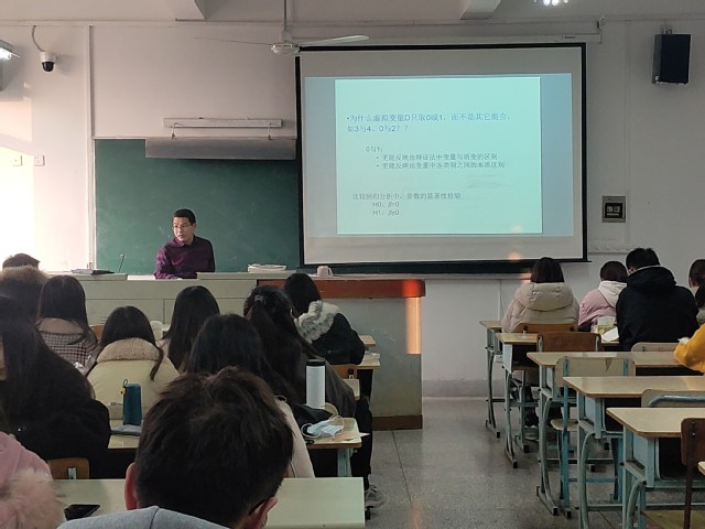 11月26日,许锋博士于教学主楼A410开设《计量经济学》全校公开示范课,许博士介绍了虚拟变量基本概念,以性别、季节等为例讲解了双属性变量、多属性变量的虚拟变量设置方法与技巧,从马克思主义哲学中质变与量变关系的角度分析了虚拟变量“0-1”设置的原因。在此基础上,讲解了将虚拟变量引入模型的两种基本方式,即加法方式与乘法方式。许老师使用现实事例将较为枯燥的计量模型变成有意思、有意义的应用性课程,同时,将思政元素纳入课堂,启发了学生思考,提高了学生对该课程的认知层次。