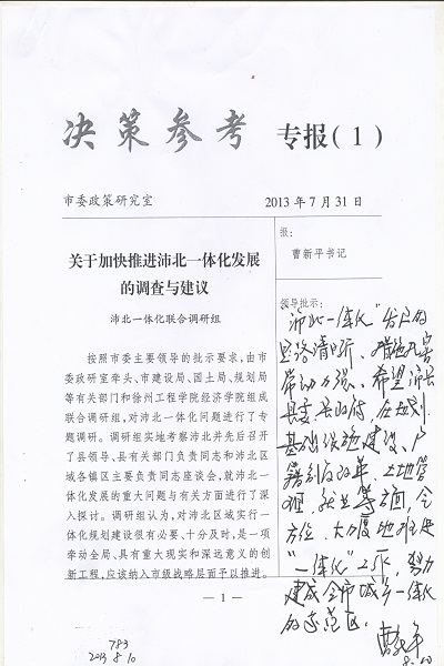 暑假期间,经济学院孙勤教授、邵川副教授所参与的,由徐州市委政策研究室牵头组织的徐州市沛北一体化发展规划项目调研小组在深入细致的调查研究基础上,将调研报告“关于加快推进沛北一体化发展的调查与建议”专报徐州市委领导,8月10日曹新平书记批示:“沛北一体化”发展的思路清晰,措施扎实,带动力强,希望沛县县委、县政府在规划、基础设施建设、户籍制度改革、土地管理、就业等方面全方位、大力度地推进“一体化”工作,努力建成全市城乡一体化的示范区。