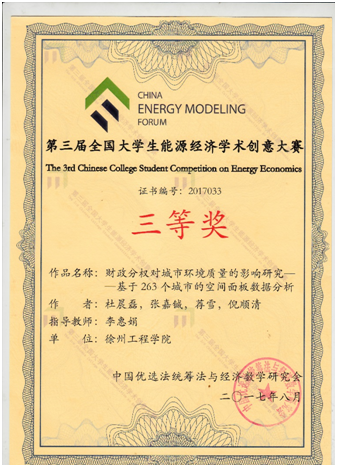 2017年8月20日,第三届全国能源经济学术创意大赛决赛在北京航空航天大学圆满落幕。由经济学院李惠娟博士指导、2015级学生杜晨磊、张嘉铖、荐雪和倪顺清4位同学完成的作品“财政分析对城市环境质量的影响研究——基于263个城市的空间面板数据分析”在比赛中荣获全国三等奖。