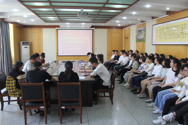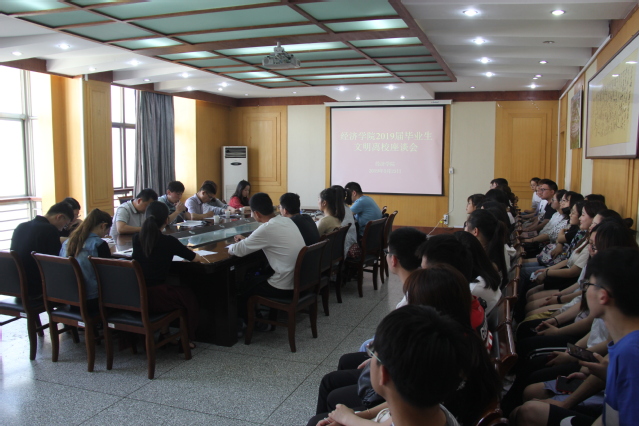 5月23日下午,经济学院在会议室召开2019届毕业生文明离校工作座谈会。校学生处宿管科副科长刘俊义老师及相关工作人员,经济学院学生科副科长赵彬老师、全体辅导员,毕业班班长、团支书和部分学生代表参加了本次座谈会。