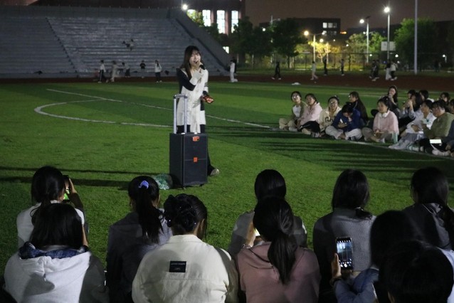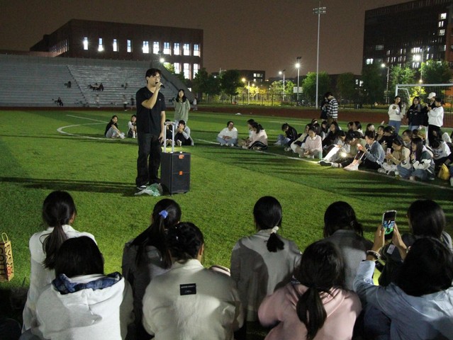 歌以潆声,曲以回乐。音乐让心灵相通,歌声在星空下相遇。活动现场灯光阑珊,同学们三五成群,席地而坐,共同聆听这场美妙的音乐会。灯光下,吉他的木纹在光影中闪烁,学生们眼眸流转,被音乐深深吸引,脸上洋溢着青春的笑容。同学们随着节奏摇摆,在《十二月的奇迹》中回忆青春的美好与纯真;在《爱情转移》中感受爱的汹涌澎湃和不可阻挡,爱既温柔又充满力量;在《泪桥》中沉浸夜晚的静谧与温馨,仰望星空,治愈心灵。